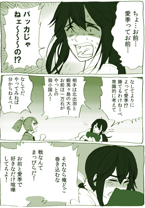 ずいぶん間が空きましたが、漫画のつづき 安東家も、石高的には小野寺家とそんなに違いはないのですが、 北方貿易を独占していたのは大きいと思います 中央の権力者にラッコの皮とか献上していたようです 羽後の内陸大名(戸沢、六郷、小野寺etc)と比べると、良港を持っていることや 中央とのぶっといパイプ、洗練された文化も合わせて格の違いを感じます つまりインテリで金持ち(not成金)、加えて戦上手と名高い安東愛季… なにこの嫌味なキャラ… たくさんの拍手ありがとうございました!「鹿を追う」の続きの線画ができあがったので 近く最終話をアップできると思います~ 続きにほんの小ネタをば。 興味本位で、有名な戦国ゲームの定番・信長の野望天下創世で