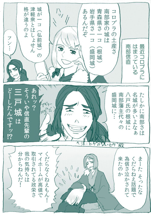 手のひらに爪が食い込むくらい固唾を飲んで見守っていました! 個人的にはあきこさんの演技が一番記憶に残ってます。 後半すごく楽しそうで… 見ているこっちが幸せになった瞬間でした。 それとは全く関係のない話ですが。 管理人はコロプラという携帯ゲームをやっています ご存知の方も多いかと思いますが、要するに位置登録ゲームです 遊び方はいろいろあるのですが、その一つにお土産収集があります。 全国各地にバーチャルお土産が設定されていて、 特定の場所で位置登録するとお土産が購入できます で、各地の城の置物もお土産としてシリーズ化されていて、 これを集めるのが戦国ファンの管理人にはたまらん楽しみなわけです そのコロプラのお土産ネタです。 ゲーム未プレイの方にはちんぷんかんぷんな話で申し訳ないので 続きにしまっておきますー 連日拍手ありがとうございました!嬉しかったです!^^ 家臣(政栄)の家はお土産になってるのに 殿様(信直)の家はお土産になってないという事実 ※盛岡城完成は信直死後 他の県は城シリーズが一個しかないところも多いので、 弘前城と根城がお土産になっている青森県は恵まれてる方だと思います あの城はお土産になってるのかな!?と探すのも楽しい PR この記事にコメントする