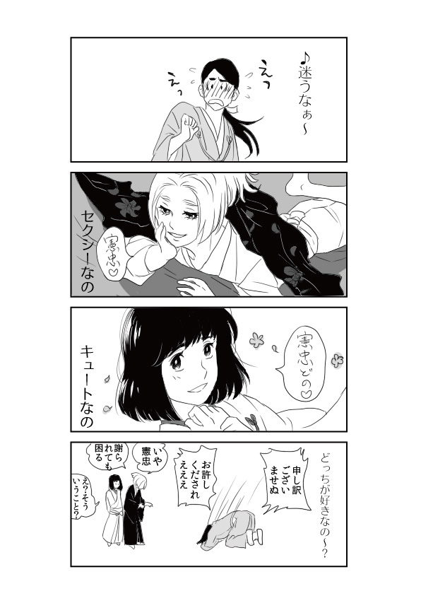 時間がかかって思った以上にしんどいです… でも屋裏の変シリーズは時間がかかっても何とか当初のゴールラインまで たどりつけたので、自分を叱咤激励して頑張りたいと思います! 拍手おへんじです。反転して読んで下さい。 コメントなしの方も、とっても励みになっています。いつもありがとうございます!! >10月17日「顕房と道真コンビ~」の方 拍手ありがとうございました!! 顕房の家臣といえば道灌の方が年齢は近いのですが、 まだ家宰は道真なので、当家設定の道真と顕房が絡んだら どうなるのかな~?と思って描いてみましたw 続きはおそらく別漫画でご覧いただけると思うので、 お待ちいただければ幸いです^^ 続きに漫画を入れておきます。 鎌倉の若者たちのギャグですがちょっと腐要素があります。 幼なじみ(上杉顕房)と上司(成氏)が年下のかわいこちゃんだなんて 憲忠ってばガチハーレムじゃないですかーーー!!屋上!!!! でも憲忠は据え膳に全力で土下座してしまうタイプなので 全然楽しめないだろうと思います(…) ※成氏と顕房がセクシーでもキュートでもないのは目をつぶってください PR この記事にコメントする