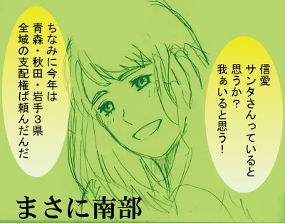 だいぶ時期を逃してしまったよー メインまんがの汚いネームを流用 南部信直って家督相続後 「津軽&九戸の二人の謀反人のせいで大変でした><」って顔をしながら ちゃっかり東西南北に自分から戦争を仕掛けてますよね… 全方面に侵略戦争(北は内乱鎮圧とも言う)って、それ戦略的にどうなんだろう 特に南下政策って下☆克☆上ですよね 結果南と東には南部領は広がり、外交フル活用でさらに盛岡以南も手に入れている。 行動パターンがまんまTSUGARUと同…うわ何をするやめくぁwせdrftgyふじこlp; 関係ないけど岩手県「南部」が伊達領、「北部」が南部領で 南部領最南端に配置されたのが北氏って、 色々な意味で最高にわかりにくいと思います いつも拍手ポチッと押していただいてありがとうございます!! つづきに拍手コメお返事です。 >しょっぺ様