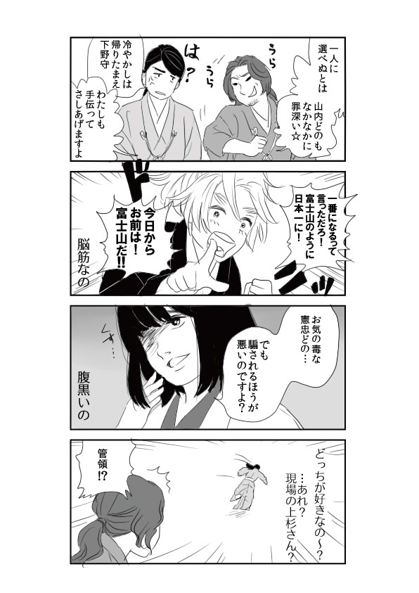 メインまんが「monster」2p追加しました。 リンクさせていただいている素敵サイト様、いつもお世話になってます…! こんなところで申し訳ないですが、愛してますっっ 見に来てくださる方も、たくさんの拍手ありがとうございました!!! 続きに鎌倉ヤングのまんがの続きを入れておきます~ 憲忠逃亡 イチゴに興ずる小山持政と結城成朝(後姿だけど) ネットで成氏のことを調べてると、 「成氏は肉食系…いや、狩猟系男子だったんだよ!!」とか「親父と同じ単細胞」とか いろいろ言われていて爆笑してしまいます でもいちばん笑ったのはこれです 『信長の野望蒼天録』武将検索 「野心」の値に注目していただきたい さすがコーエーさんわかっていらっしゃる…!! PR この記事にコメントする