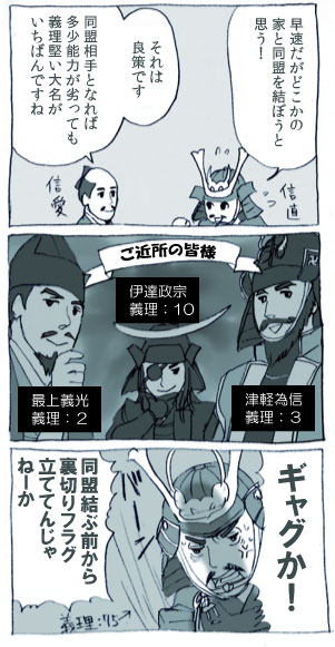 大名になった後の松前慶広のイメージは、思考は未亡人、行動は外道です (いやいや) まだまだ勉強し始めたばかりですが、蠣崎さんちはまた壮絶な家ですね 慶広周りをざっと見ただけでも ・慶広のお姉ちゃんがパパの叔父さんとグルになってパパを松前(=謀殺)※未遂 ・それが露見してパパが叔父さんを松前(=粛清) ・それにもめげずお姉ちゃんがお兄ちゃんを松前(=毒殺) ・パパがお姉ちゃんを松前(=粛清) ・慶広が孫と謀って息子を松前(=粛清) いくら戦国とはいえ、血の濃い近親でこんなに殺し合うものなんですね…(((゜д゜))) 一人のDQNによるものならまだしも、慶広パパ・季広や、慶広の孫・公広の行動を 見るとどうも家の体質として染み付いているように見えてならない件 拍手ありがとうございました!!^^ PR 更新:メインまんが「島守」追加しました。
