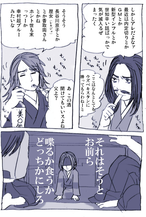 しかしうちの信直の鎧の似合わなさは異常。 紫の上が武装(!)していると思えばさもありなんと思うけど。 何かきっかけがなければカラーは描かない人間なので リクエストをいただけるのは描いてる本人にとってもありがたいです。 (描き始めればむしろ熱中して描くのですが) 3000hitも近いですが、またリクエストがあれば教えてください。 ところで、2年前の大河ドラマ風林火山では 2種類の鎧を使い分けていたってHPに出てた気がします。 当世具足とそれ以前の…胴丸・腹巻って言うんでしょうか? たしか信虎パパを追放してニュー武田家が誕生したのを契機に 鎧を全員一新したよ!と書いてあったと思います。 当時はちょうど二種類の鎧が混在していた頃らしいので 時代背景を逆手にとった面白い演出だと思います。 知識のない管理人は言われるまで気づきませんでしたが(あー) PR