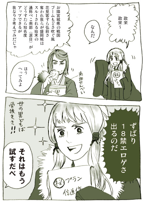 戦●姫のことかーーー!!! 司馬遼太郎「街道をゆく」の「北のまほろば」という章を読んで以来 弘前城天守閣に上りたくて仕方がないです。 津軽信枚によって築かれた最初の天守閣は五層五階で津軽藩には身不相応なくらい 立派だったそうですが、 落雷によって消失し、その後やや小ぶりな3層3階の天守が造られます。 それが現存する天守閣になります。 シバリョいわく 「天守に上ったら、本当の主役は天守じゃなくて(天守から見える)岩木山だって わかったんだよね。 最初の天守はこの眺めに邪魔だったに違いないから焼けてかえって正解だったよね!(笑)」 とのこと。別にいいんだけど信枚かわいそう。 つづきは例のエロゲネタだけどエロ要素は皆無です メインに母の日記念企画をアップしました。 信愛について延々と痛い妄想を語ってます。 ↓↓以下愚痴です 最近毛利サイトとは呼べないほど南部ネタが多くて困ります。 毛利ネタを目当てに来訪してくださる皆さんには申し訳ないと思ってます。 毛利家は大好きなんだけど、他所様のステキ毛利ファミリーで もうお腹一杯になって満足してしまう管理人がいます。 じゃあ南部の何が面白いの?と思われるかもしれませんが 自分でもよく分かりません。 知名度がなさすぎて判官贔屓システムが働いているのは確かです。 ただちょっとニッチ産業すぎる(涙) というか、世の中は戦国ブームだというのに相変わらず東北には 閑古鳥が鳴いていませんか… とりあえず江戸時代の日本地図をみんな見るべき 米はたった10万石しかとれないけど四国全部をまるっと 飲み込むほどの盛岡藩のむだなでかさ!! 21世紀の今も地元には色濃く残る存在感!!! ところで再来年の大河ドラマのタイトルはそろそろ発表なのかしら。
