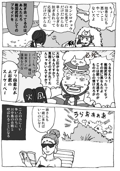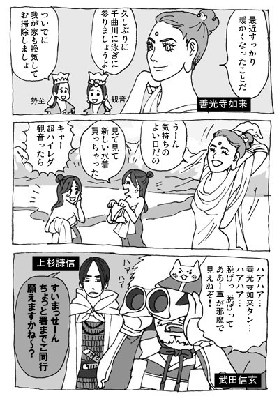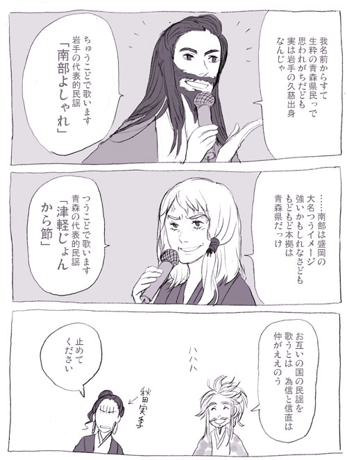 青森~岩手で震度3くらいの地震があったようですね。 お住まいの方、大丈夫でしたか? いや、別にそのニュースの地名に触発されたわけでは ない…と思うんですが…(目が泳いでんぞ) ドタバタした文章が書きたくなって書きました。 信直と晴政の仲が決定的にこじれた有名な(?)逸話から。 例によって不親切な似非南部弁です。 「こんな言葉使わないよ!」ってところがあったらぜひ教えてください。 これが管理人の限界です…。 つづきからどうぞ。結構長いです。 善光寺如来タンに会えるのは5月31日まで!(PR) でも実際会えるのは善光寺如来タンの分身である 前立本尊だったりします。 本物の如来タンは誰も見たことがないそうです。 なんという引きこもり。じゃなくて神秘。 善光寺(長野市)は戦国時代では厳島神社に 勝るとも劣らない重要な意味を持つ寺社です。 武田信玄は如来タンに憧れる余り 本尊を甲府に持ち帰り、甲斐善光寺なるものまで 作ってしまいました。信玄…。 上杉謙信にも「バカヤロー!如来タンは皆の 如来タンだって言っただろ!」(※意訳)と そのことを怒られたそうです。 その後も信長・家康・秀吉というビッグネームの間で 引っ張りだこで、戦国時代はお引越ししてばかりでした。 まさに戦国のアイドル、善光寺如来タン。 現在善光寺には信玄と謙信の位牌が並んで 納められているそうです。 ちなみに川中島は善光寺の目と鼻の先。 今回を逃せば次の御開帳は7年後の2016年。 なんとかして行きたいなあ~~ お互いの国の民には人気の唄だけど、 殿様にとってはちょっと悪い唄。 時代考証?何それおいしい? 歌詞を超絶意訳すると 南部よしゃれ → 南部ダセエwww田舎芝居乙www 津軽じょんから節 → 為信HIDEEEE みたいな感じで面白いですね(…) ヒント:どちらも南部or津軽に攻め滅ぼされた地域の民謡 そして両者の割りを食う秋田さんであった。 参考: 南部(雫石)よしゃれ http://www.bunka.pref.iwate.jp/seikatsu/minyou/shousai/minyou_011.html 津軽じょんか(が)ら節 http://senshohamada.hp.infoseek.co.jp/minyou/tugaru-word.htm