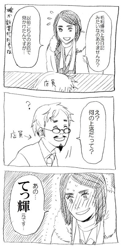 読みづらかったらクリックしてもらうと画像が大きくなります。 「私卒論に使う資料探してるんですが何か?」 みたいな感じで平然としていても いざ聞き返されると異常に恥ずかしかったという経験。 エロ本買う男性もこんな気持ちなんでしょうか(輝元を何だと思ってるんだ!) 戦国でもなんでもない。 戦国ファンの女の子の評判を毎日確実に下げている 張本人の管理人です。生きててすみません。 この後店員さんがわざわざPCで本を探してくれました。 だけど今店頭にないし年末だから 取り寄せも時間かかるよーというお話でした。 とっても親切なおじさんでした!! 帰省の電車(片道5時間)の中で読もうと 思っていたのに残念です。 帰省時に小説を読むのが管理人の習性で、 思えば尻くらえ(字が出ない)も夏草も帰省のついででした。 今度は密謀でも読もうかな… そして実家に帰ったら播磨灘が私を待っている!! 何気に初登場な亀寿姫と秀長に代理してもらいました。 配役はフィーリング。